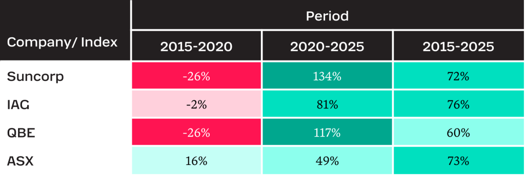 This strong performance is reflected in recent share prices, where from September 2020 – the middle of COVID-19 – to now, Suncorp, IAG and QBE’s share prices have increased at twice the rate of the broader market. (~100% vs 50%).